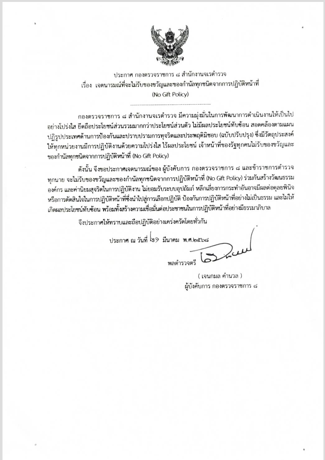 ประกาศเจตนารมณ์ที่จะไม่รับของขวัญและของกำนัลทุกชนิดจากการปฏิบัติหน้าที่ (No Gift Policy)